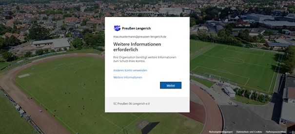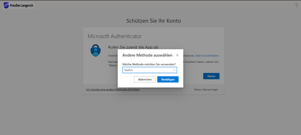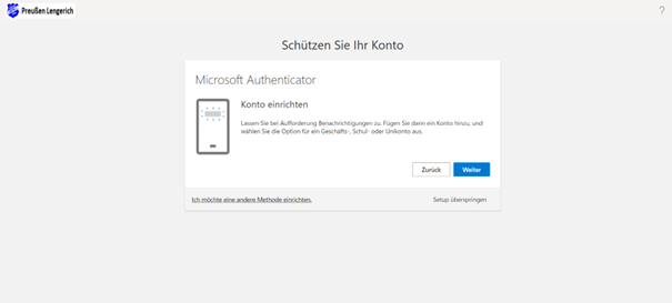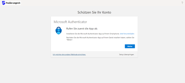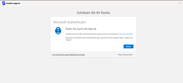 5. Nun werden Sie aufgefordert ein zweiter Faktor einzurichten. Klicken Sie auf „Weiter“