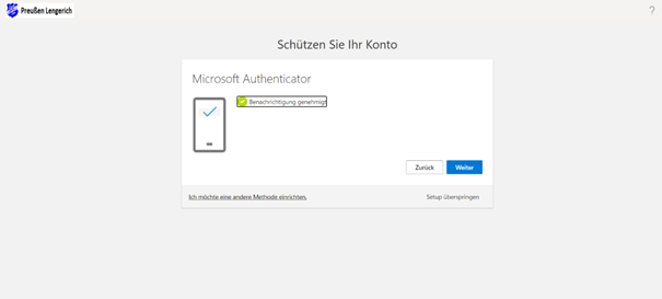 7. Die Microsoft Authenticator App ist erfolgreich verbunden. Klicken Sie auf „Weiter“ und dann auf „Fertig“
