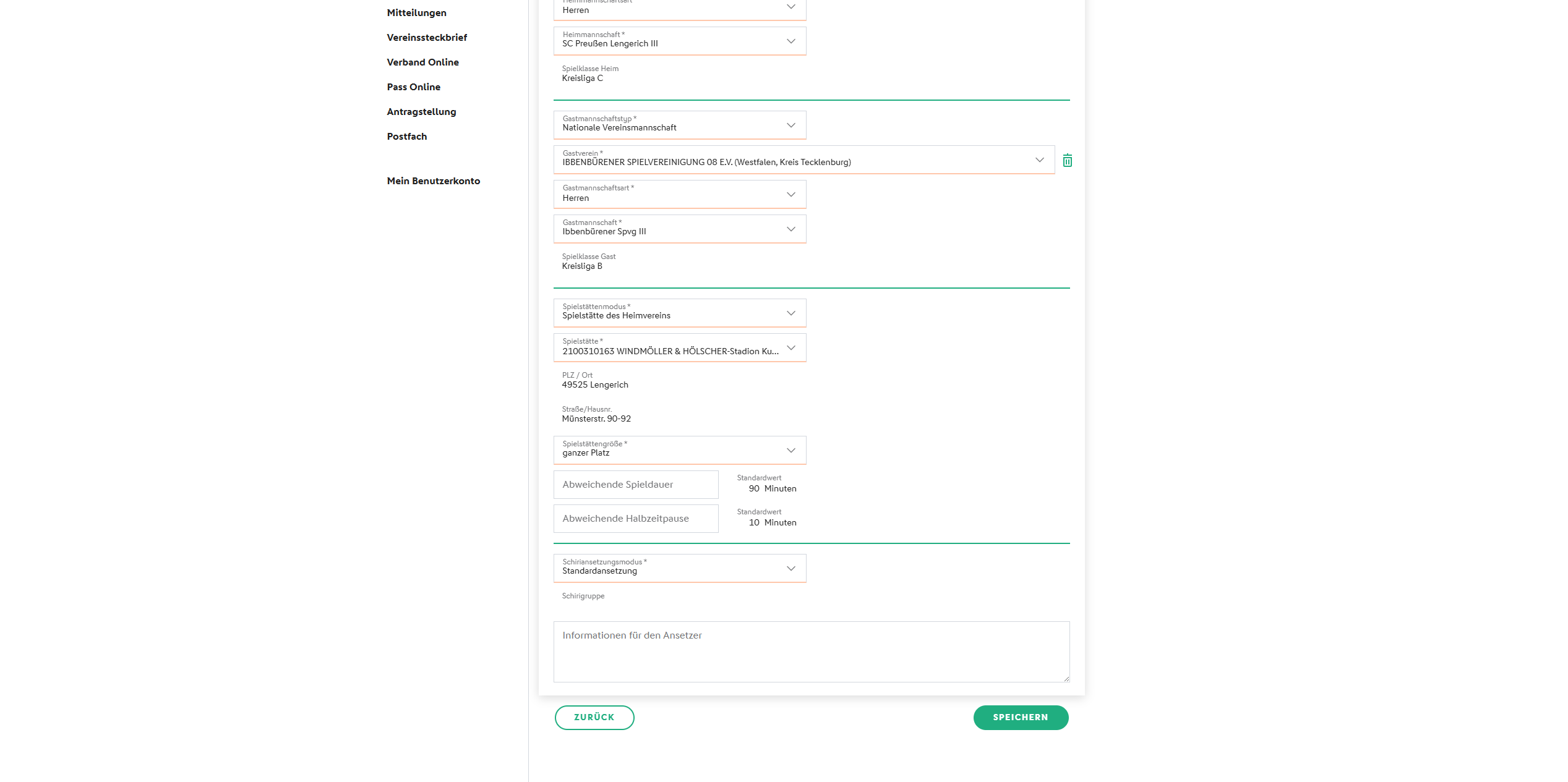 7. Nun muss noch die richtige Spielstätte ausgewählt werden. Wenn eine andere Spielzeit vereinbart ist, kann man das hier noch anpassen. In den meisten Fällen, können die Felder aber leer bleiben. Die Feldgröße ist ein ganzer Platz. Ab E-Jugend immer halben Platz auswählen. Sollte eine D-Jugend während dem Trainingsbetrieb auf einer Hälfte spielen, eine Hälfte eintragen, sonst immer ein ganzer Platz in der D-Jugend.