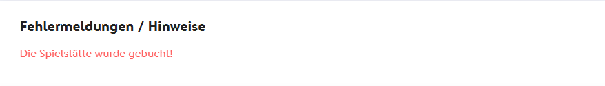 9. Auf "Speichern" klicken. Sobald man die Meldung "Die Spielstätte wurde gebucht!" erhält, ist das Spiel erfolgreich angesetzt. Man erhält eine Mail über die Ansetzung. Bei Fehlern steht oben im Feld wo das Problem liegt. Meistens hat dann eine Mannschaft zeitgleich noch ein anderes Spiel.