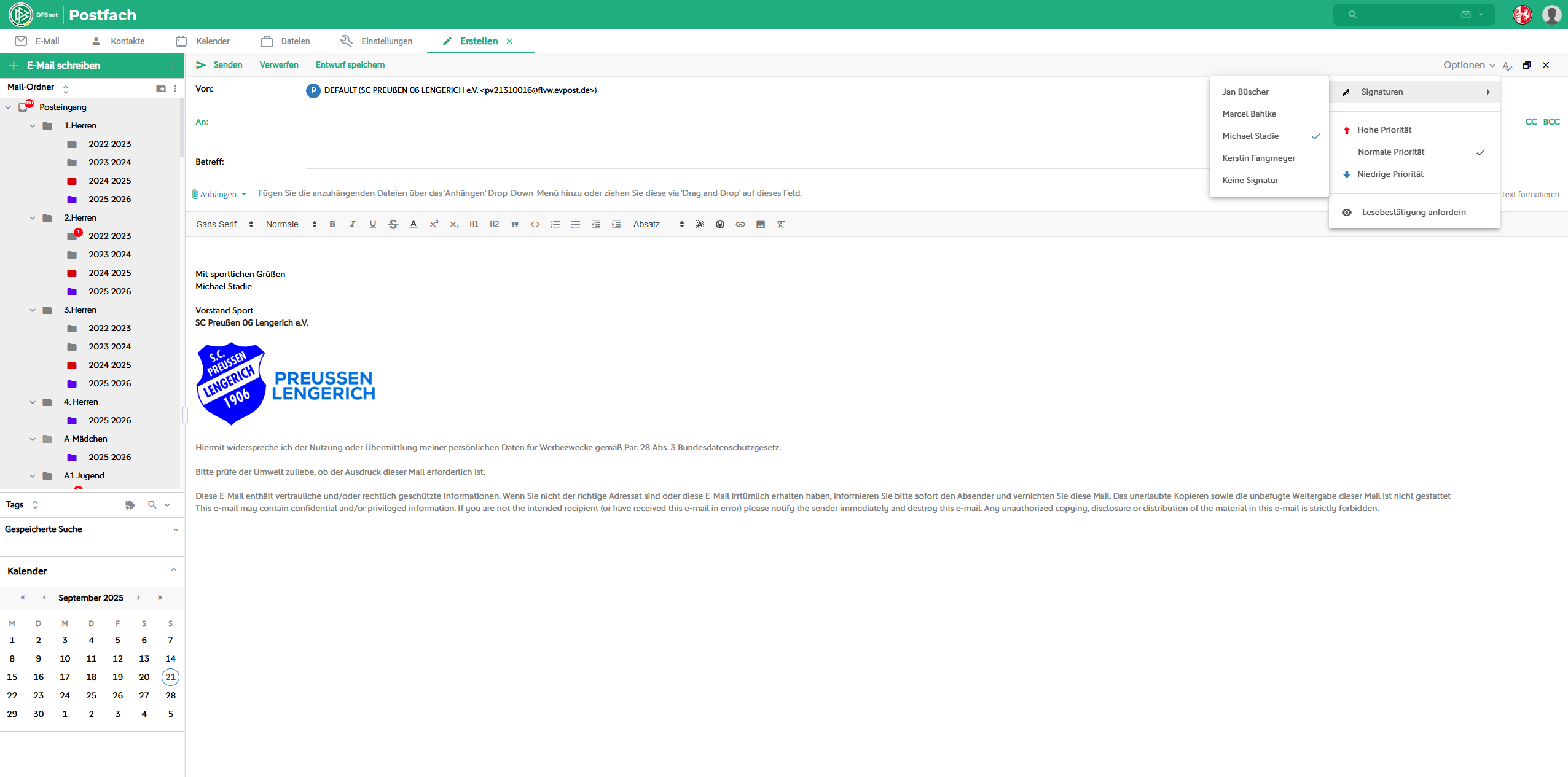6. Die Signatur kann oben rechts unter "Optionen" -> "Signaturen" geändert werden.