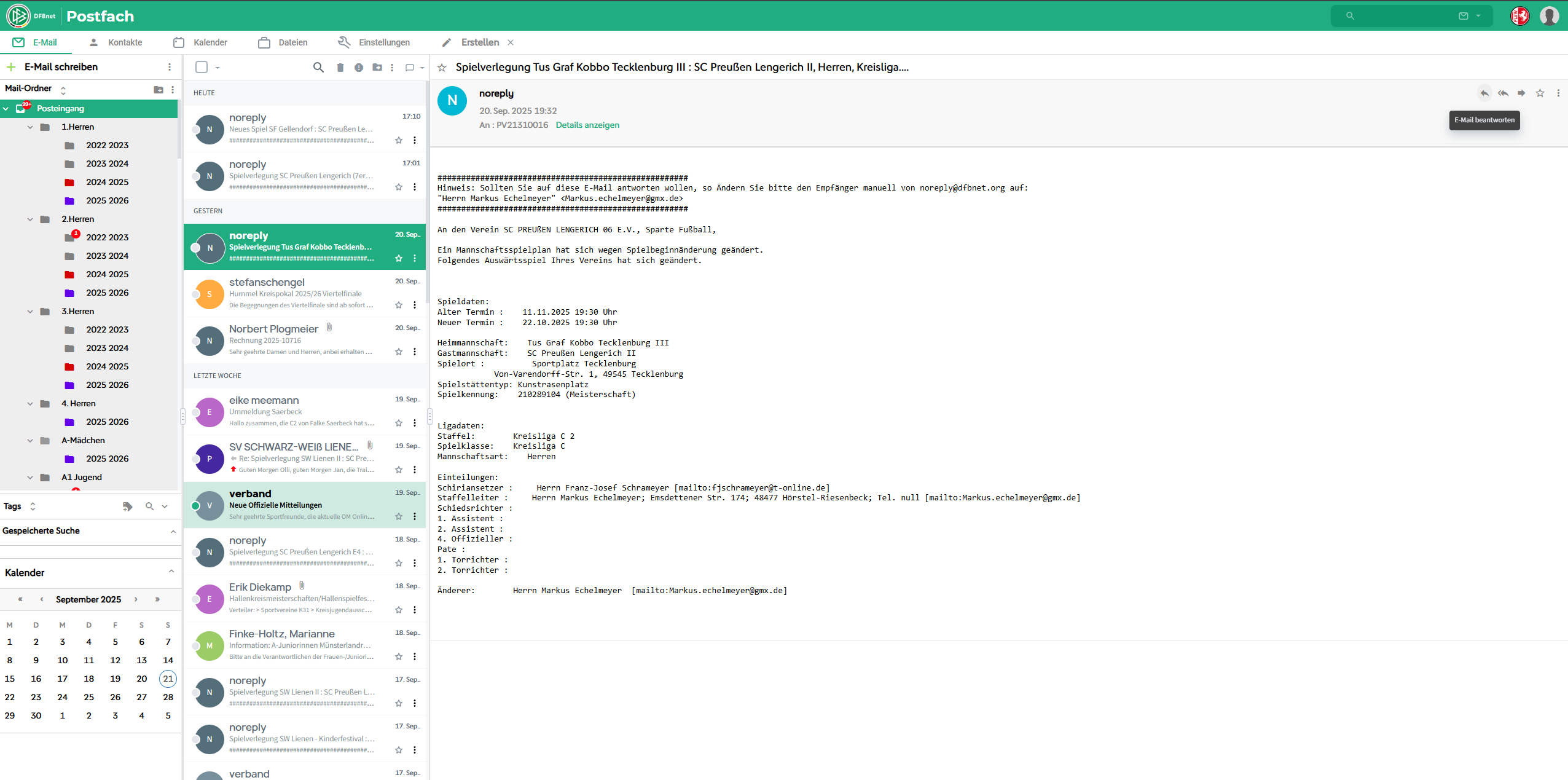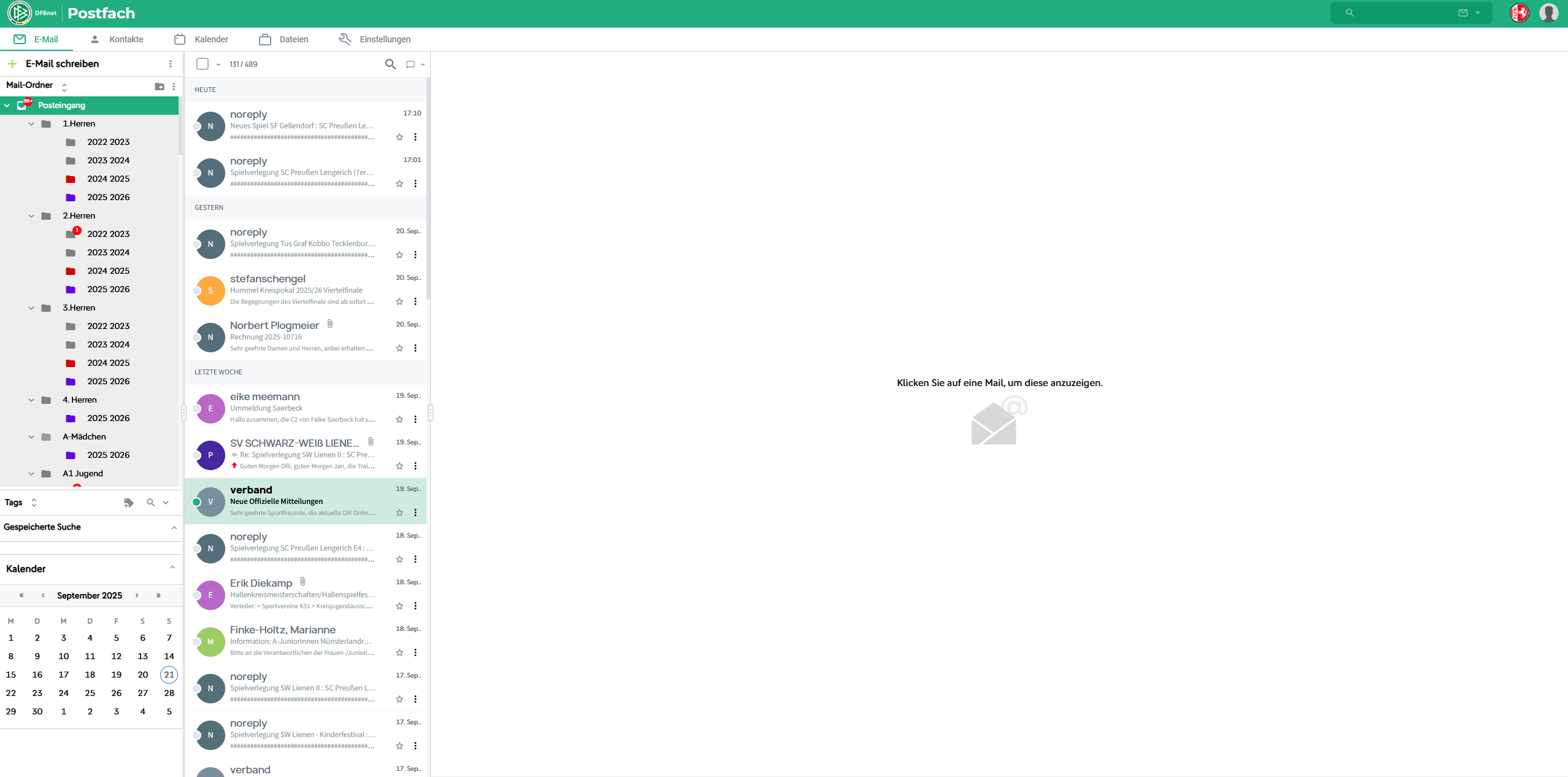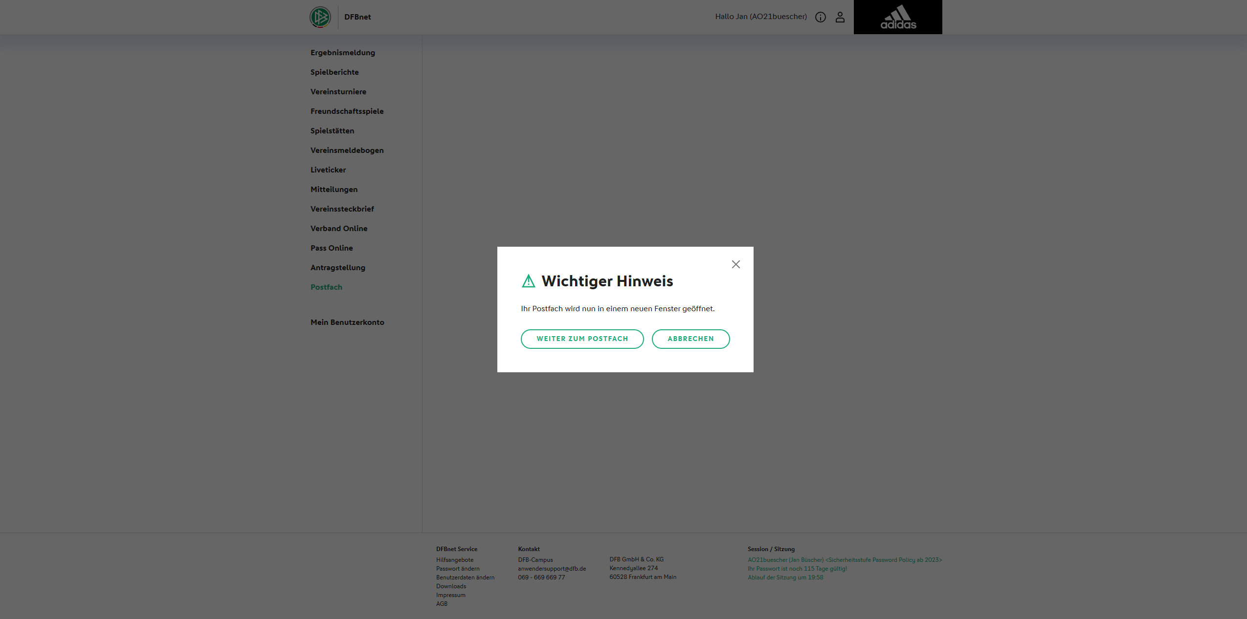 4. Man landet auf der Startseite. Ganz wichtig: Es werden keine E-Mails an Trainer weitergeleitet oder zugeschickt, da alle E-Mails automatisch im Ticketsystem ankommen und da bearbeitet werden. Die E-Mails benötigt man nur, wenn man Richtung Kreis oder einem anderen Verein antworten möchte. Das DFBnet Postfach lässt keine Mails vom Ticketsystem oder Euren privaten E-Mail Adressen zu.