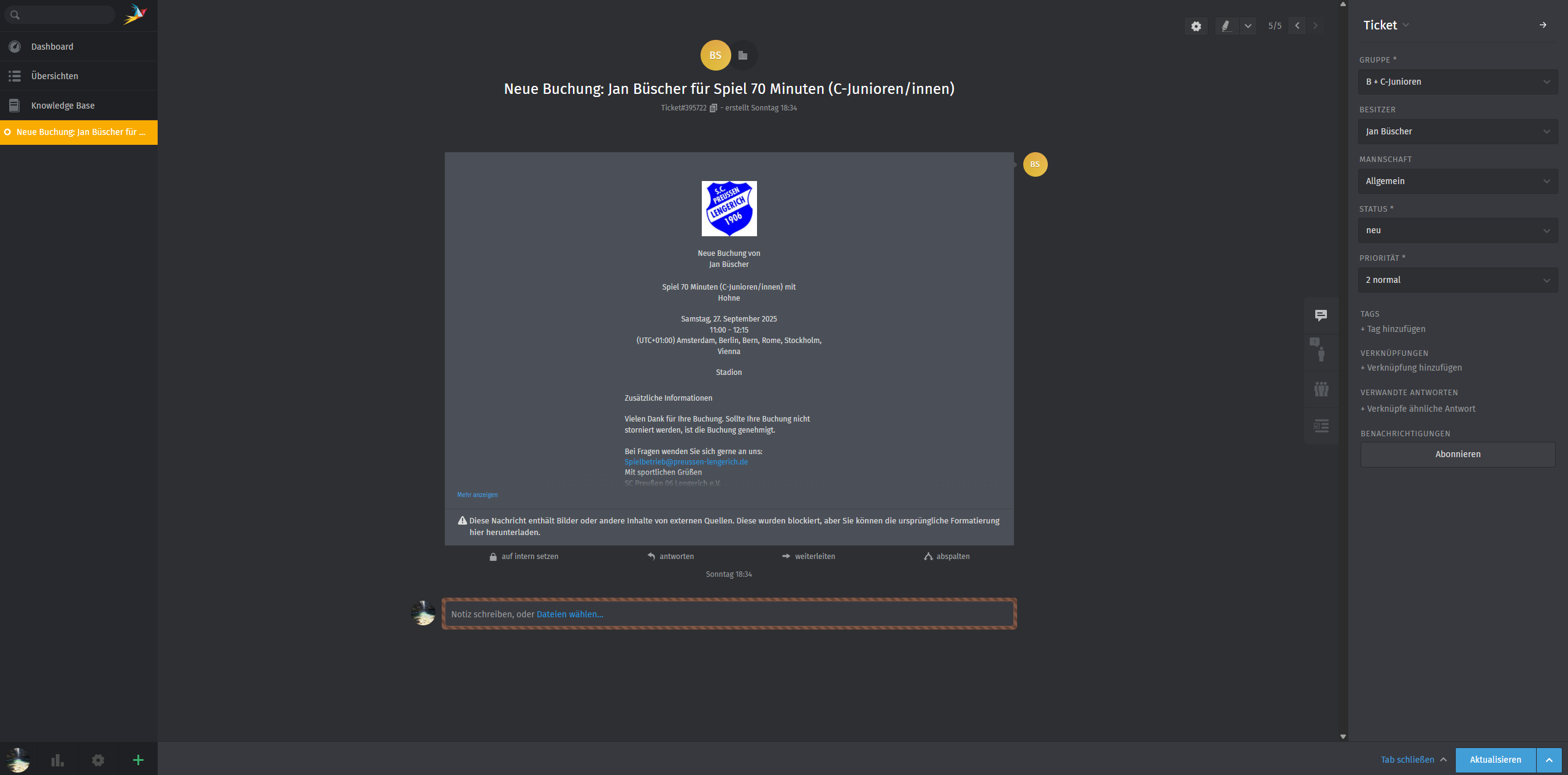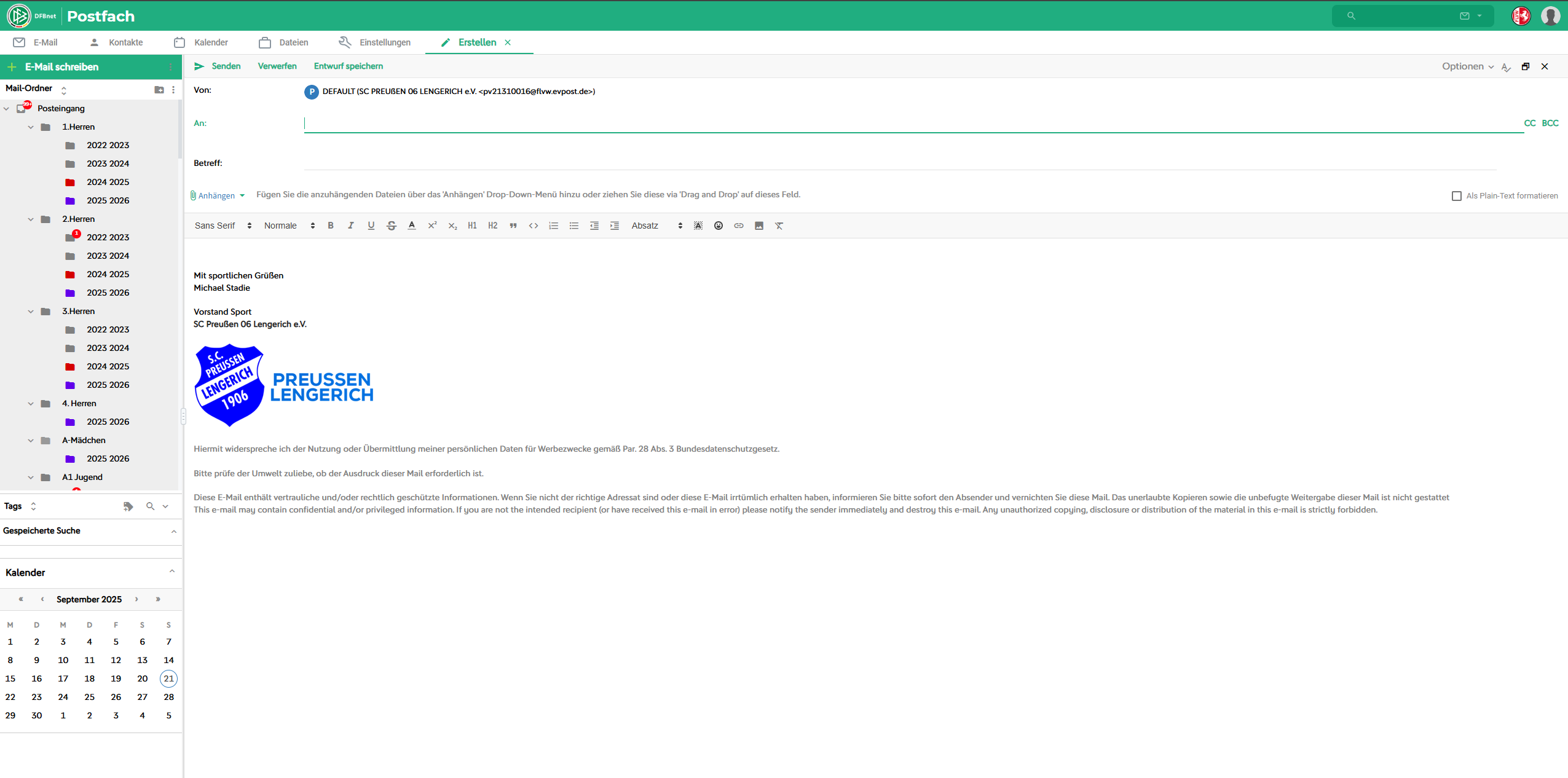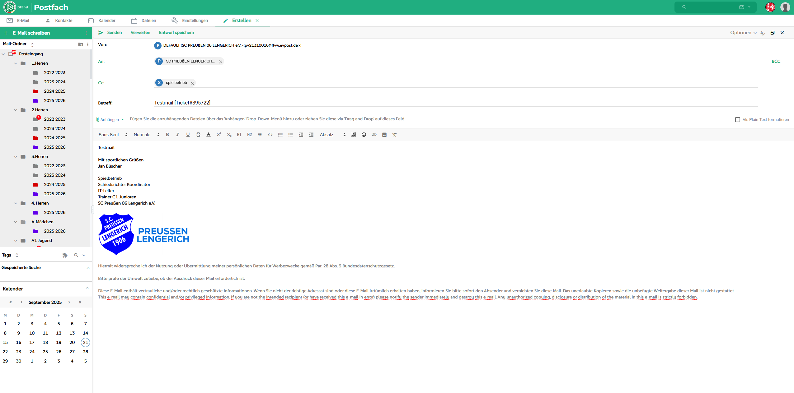 8. Wir tragen im CC spielbetrieb@preussen-lengerich.de ein, damit diese Mail auch in das Ticket kommt. So sieht jeder, dass eine Mail im DFBnet Postfach erstellt wurde.