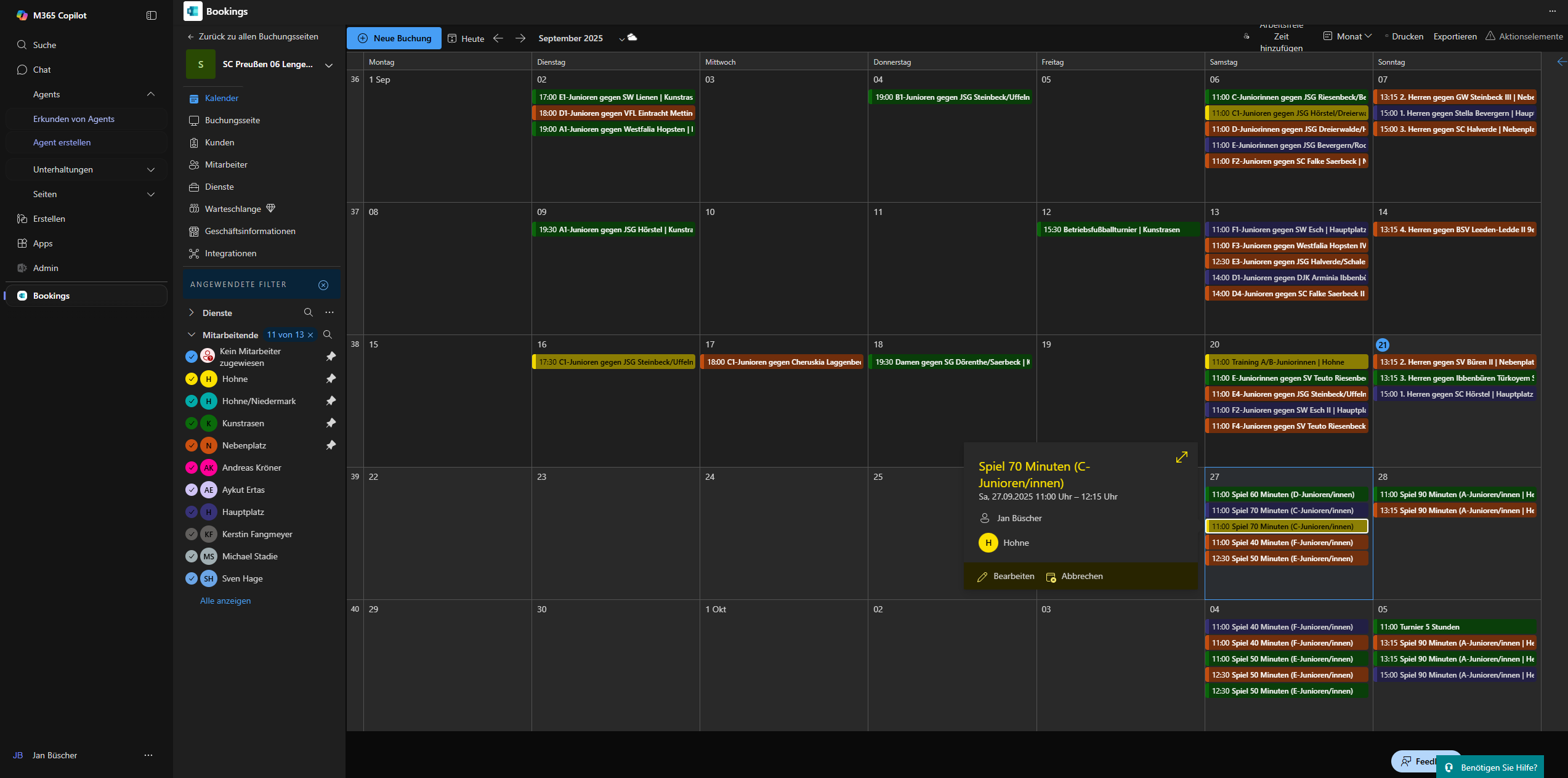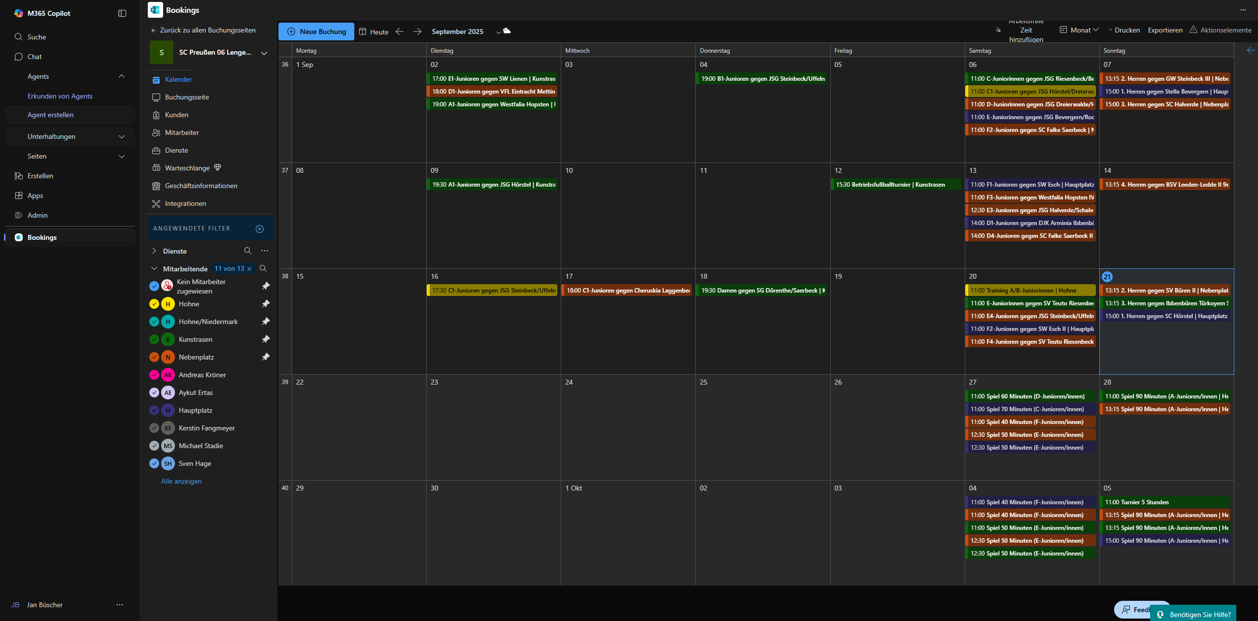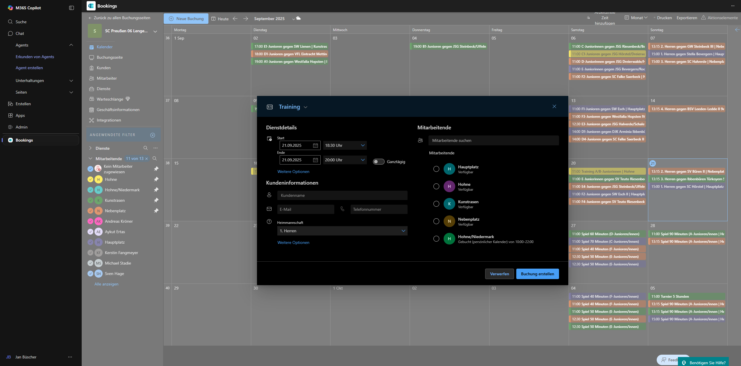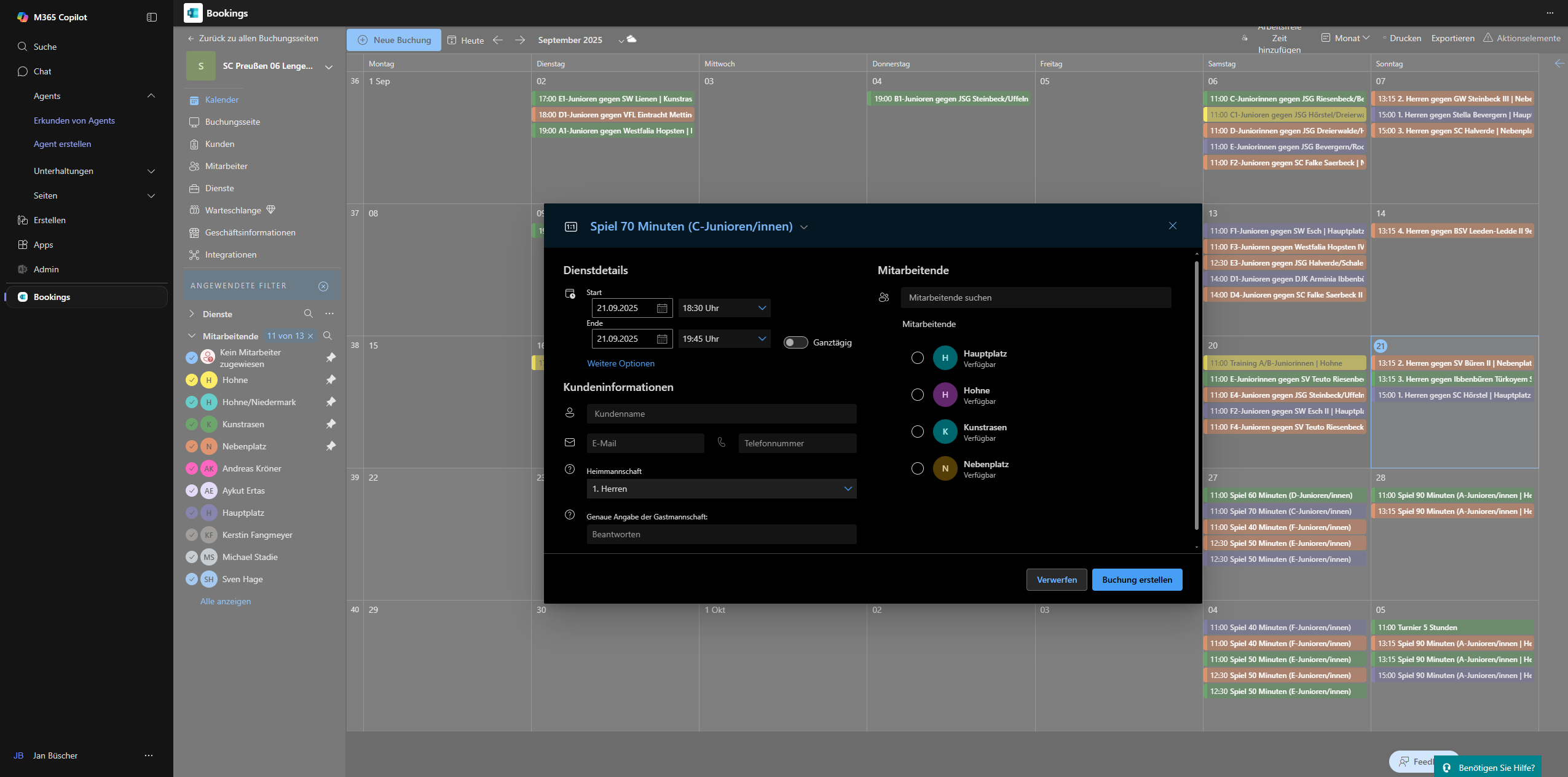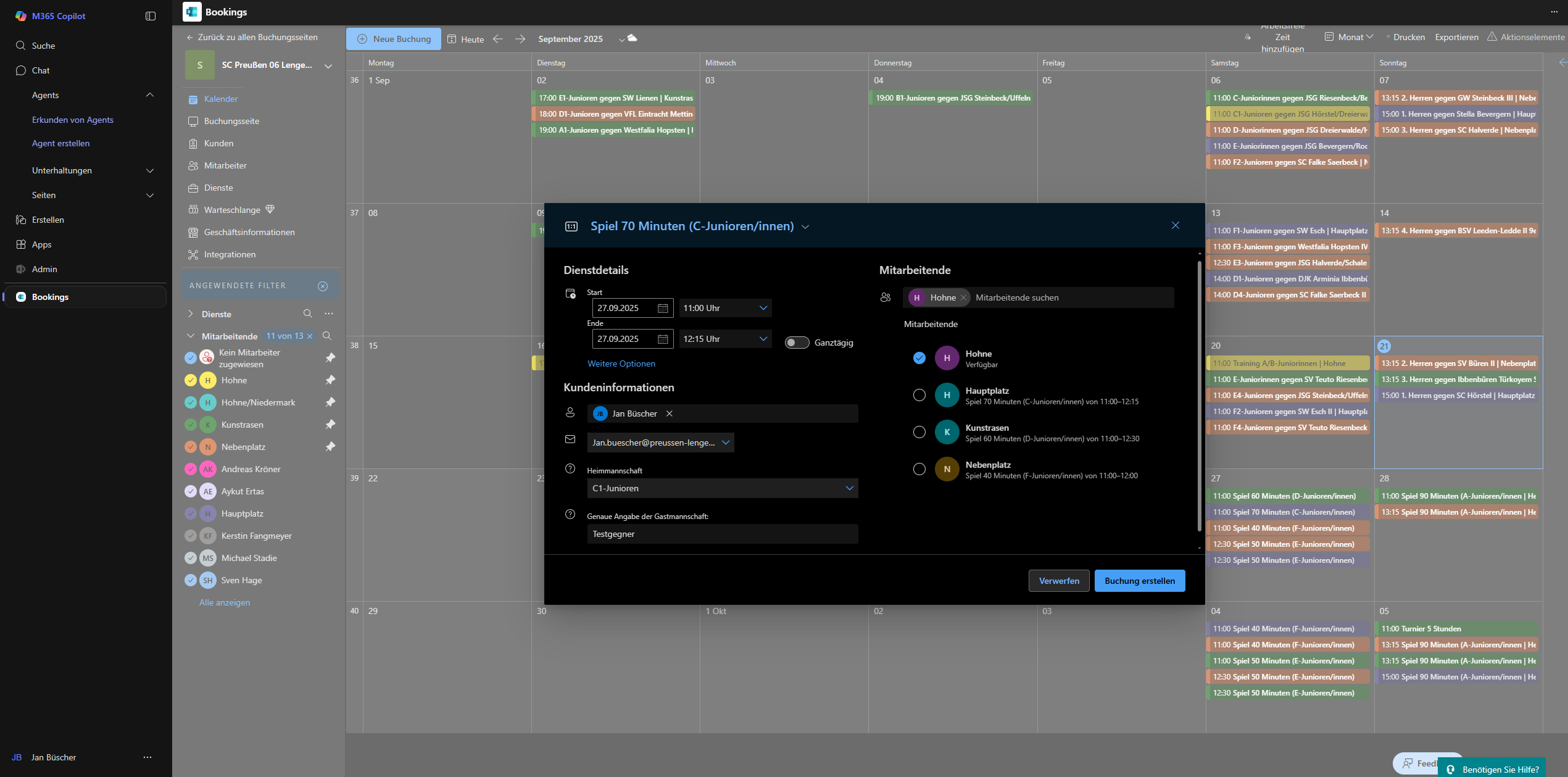 7. Nun gebe das Datum ein und die Startuhrzeit. Die Enduhrzeit übernimmt das System automatisch. Trage die Kundendaten ein (Immer Spielbetrieb als Kunde auswählen, es sei den ein Trainer fragt die Buchung an, dann diesen auswählen). Wir nehmen Jan als Beispiel. Heimmannschaft auswählen und Gastmannschaft auswählen. Rechts dann noch den Platz zuordnen.